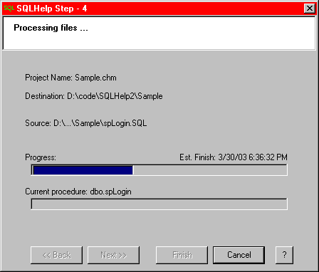 The system will parse through the SQL batches in the source folder defined in step 2 looking for the various tags in the batches to produce the final output according to the project options. During this processing, the progress indicator will increase. The current file is listed above the upper progress indicator, and the batch progress is indicated below that.